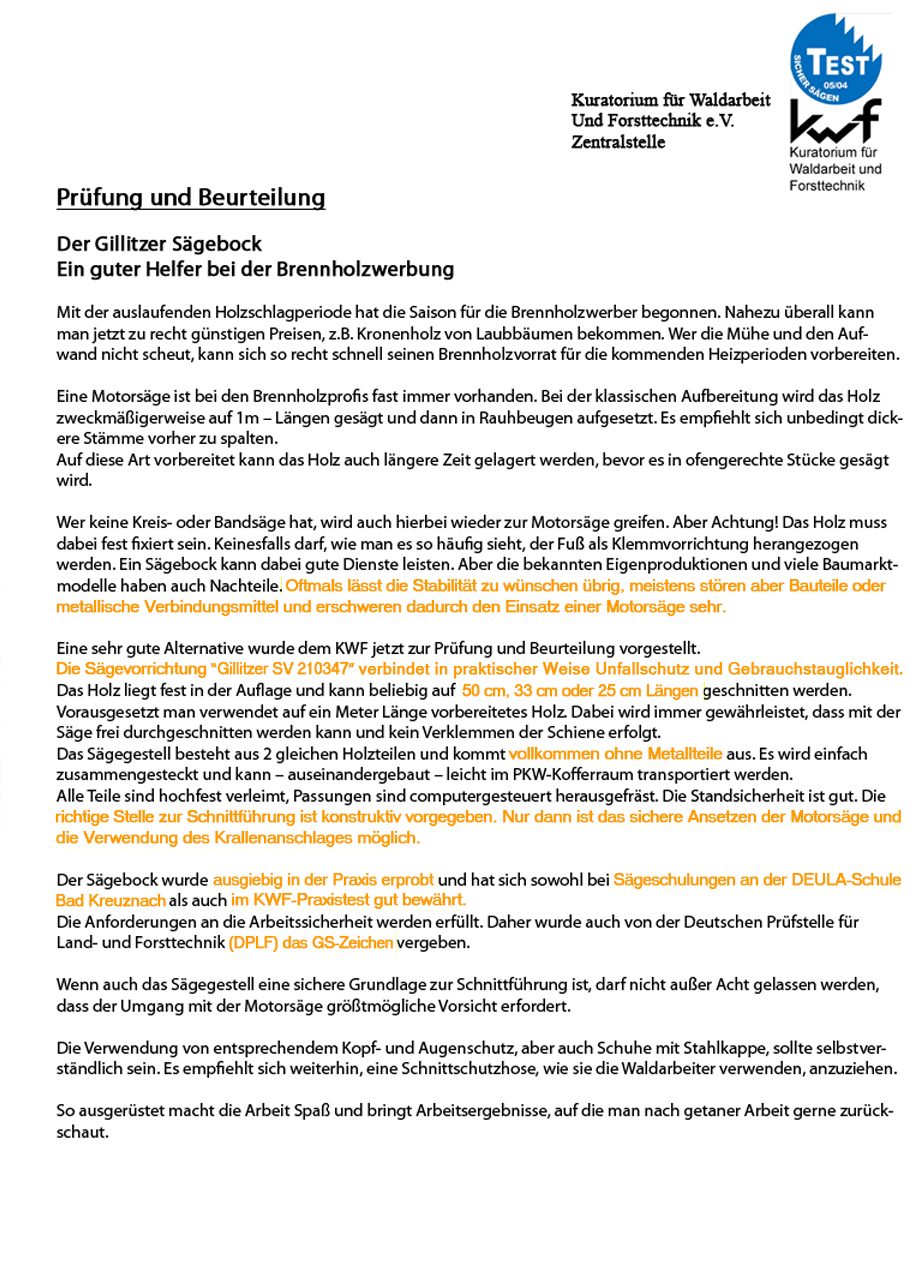 Der Gillitzer Sägebock® im KWF Praxistest, Prüfung und Beurteilung vom Kuratorium für Waldarbeit Und Forsttechnik e.V. Zentralstelle