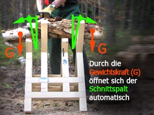Endlich ein Sägebock, der ohne wenn und aber funktionstauglich ist. Weil das Holz mit dem Krallenanschlag der Motorsäge fixiert werden kann, wird ein Mitdrehen verhindert. Ein weiterer Vorteil ist, dass konstruktionsbedingt stets außerhalb der Mitte des Sägebockes geschnitten wird. Dadurch fällt das Schnittgut automatisch zu Boden, Schienenklemmer gehören der Vergangenheit an. Unser Fazit: Einfach genial!